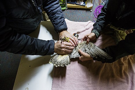 The falcon, wearing a hood to keep it calm, trembled under Don Veltkamp’s hands as Fink stretched the wing out multiple times. Veltkamp and Fink are married.