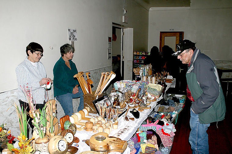 Ruth Johnson and Sue Braatten stand by as Jerry Dalton looks over the selection of handmade woodcarvings for sale.