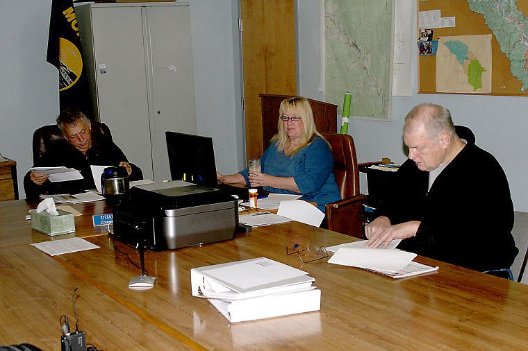 County Commissioner Duane Simmons, Cindy Grimm and Dennis Hildebrand look over a series of letters to be delivered to the Forest Service. The letters were composed by MCRAG and addressed the commissioner's concerns about the West Mullan Fire cleanup and the Cedar Thom project.