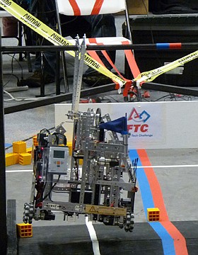The team endured five rounds of competition. The field comprises a center bridge, pull-up bar, and two pendulums – each with four pendulum goal baskets. The event is timed and is split in two parts. First is a 30-second autonomous section where the robot picks up two-inch yellow, plastic blocks in the center of the field and places them in a goal basket, then parks on the center bridge. Next, during a two minute driver-controlled portion, students must make the robot raise a flag and hang the robot from the pull-up bar in the center of the field.