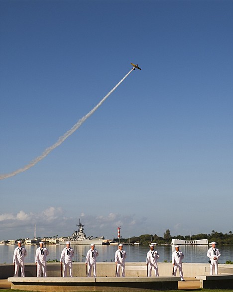 A vintage World War II-era airplane - a 1944 North American SNJ-5B - flew overhead to break the silence. The Hawaii Air National Guard has used its fighter jets and helicopters to perform the flyover for many years, but federal budget cuts prevented it from participating this year. The Navy and National Park Service co-hosted the ceremony, which was open to the public.