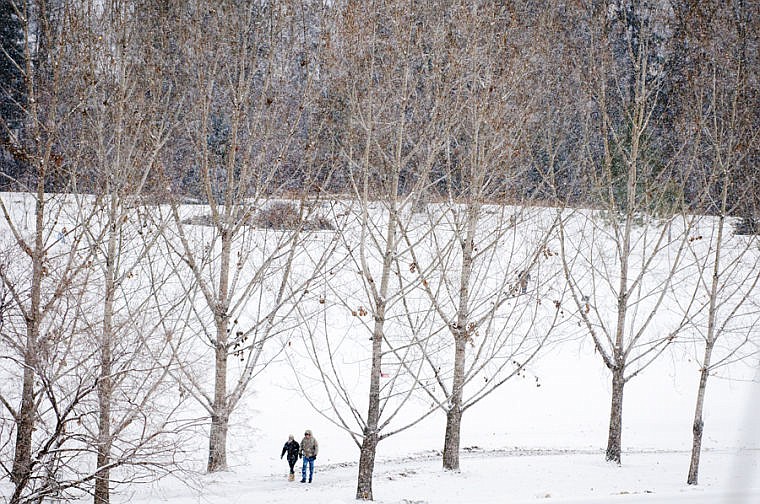 As snow begins to fly a couple takes an evening stroll Monday through Lawrence Park. Dec. 9, 2013 in Kalispell, Montana. (Patrick Cote/Daily Inter Lake)