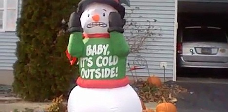 Less than 12 hours after the display was completed, someone stole two major decorations from his home: an animated, inflatable "freezing snowman" that shivers and is wearing a T-shirt that says "Baby, it's cold outside," and an inflatable Santa Claus driving a boat with two reindeer water skiing behind it.