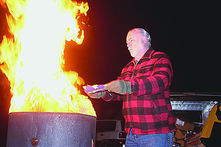 Approximately 15 people gathered, battling the frigid temperatures to honor the flags. The group grabbed the folded flags and placed them into a barrel of flames, retiring each flag one by one.