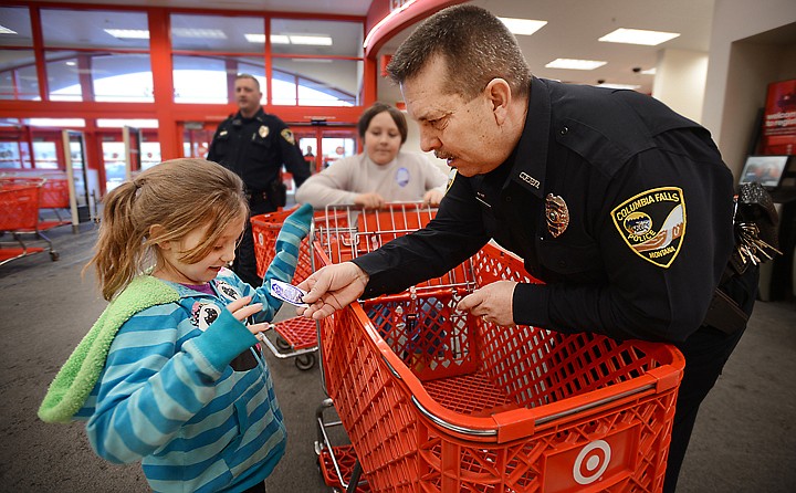 Steve Hughes of the Columbia Falls Police Department gives a badge sticker to Tory Lewis, 6, before the police officers and children split up to go shopping on Wednesday at Target during the annual Shop with a Cop outing. (Brenda Ahearn photo/Daily Inter Lake)