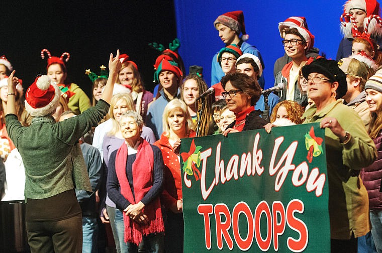 Community members join in with Whitefish High School choirs during a staged performance of We Wish You a Merry Christmas Wednesday evening at the Whitefish Performance Arts center that was filmed to be sent to troops overseas. Dec. 11, 2013 in Whitefish, Montana. (Patrick Cote/Daily Inter Lake)