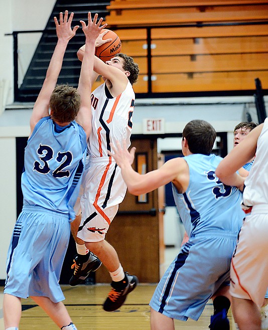 Flathead senior Chandler Escalante (23) puts up a shot over Brendan Howard (32) of Great Falls during the first half of Saturday’s game at Flathead.