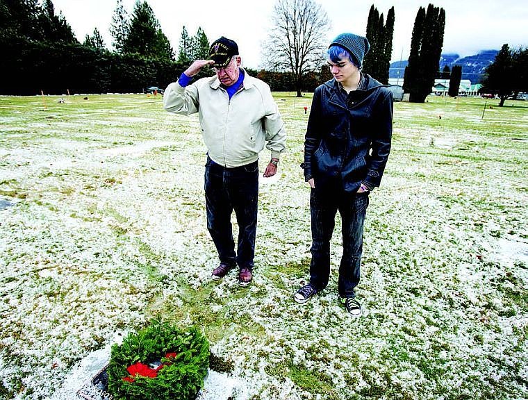 The Civil Air Patrol Coeur d’Alene Composite Squadron sponsored the wreaths. About 10 cadets in blue service uniforms stood tall during the ceremony while Cadet Capt. Isaiah Livingston, 18, of Spirit Lake, read the opening remarks to the crowd.