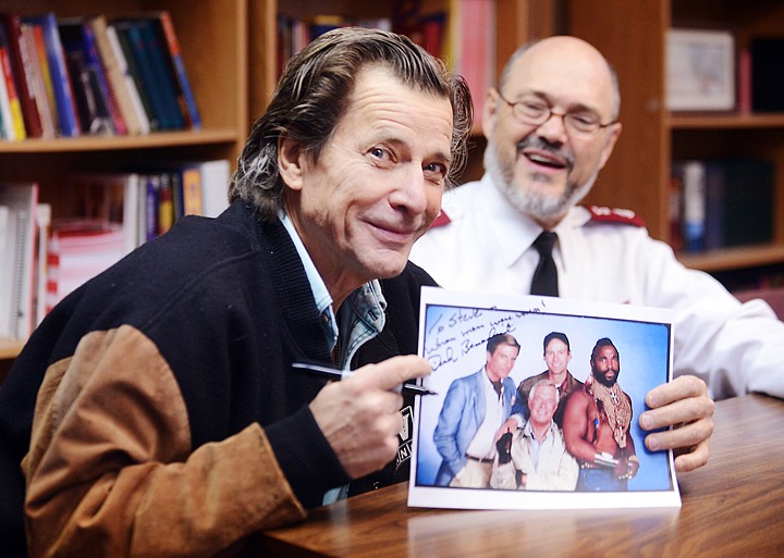 Dirk Benedict, one of the stars of the TV show A-Team signs an autograph for Steve VanFossen, a fan, as he does a promotional spot for the upcoming Salvation Army fundraiser gala which will feature dinner and dancing, vintage automobiles and a silent action on March 22nd at the fairgrounds in Kalispell. In the background is Major Steve Svenson, Commander of the Salvation Army of Flathead County. (Brenda Ahearn/Daily Inter Lake)