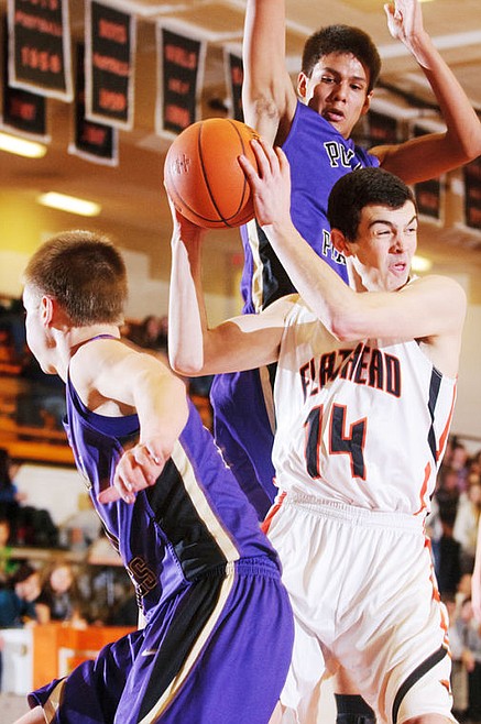 Flathead senior Tommie Owens (14) looks to pass as he fights his way past two Polson defenders Thursday night during a nonconference basketball game at Flathead High School.