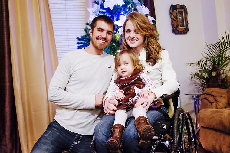 Starla Hilliard Barnes, her husband Shannon Barnes and their daughter Elissiah pose for a Christmas portrait at their Kalispell home. Family and friends are trying to raise $100,000 for walking braces and a specialized rehabilitation for Starla, who was paralyzed in a hit-and-run accident four and a half years ago in downtown Kalispell.