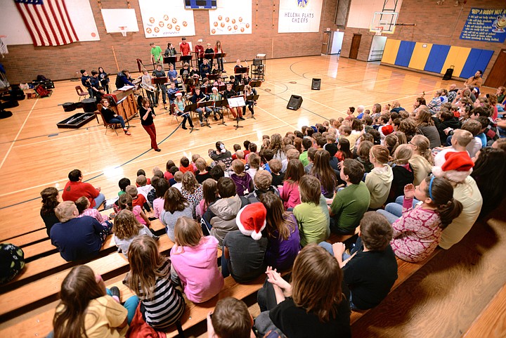 Karen Ulmer, director of the Columbians, addresses the assembled students at Helena Flats School on Friday, December 20. In the background are members of the Columbians, the premiere band at Columbia Falls, and students from the band at Helena Flats. Sally Newberry, band director at Helena Flats said she approached Ulmer about having some of her students join with the Columbians earlier in the year. "This has been the best field trip, the best experience," said Newberry. Newberry hopes to make this an annual event. (Brenda Ahearn/Daily Inter Lake)