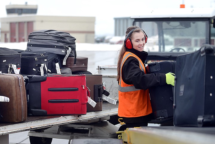 Laura Squires of Skywest loads bags onto a plane about to take off on Monday, December 23, at the Glacier Park International Airport. (Brenda Ahearn/Daily Inter Lake)
