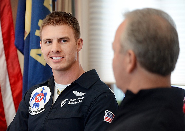 USAF Cpt. Jason Curtis looks over and smiles as Joe Unterreiner talks about the air show that will be returning to Montana in August of next year. (Brenda Ahearn/Daily Inter Lake)