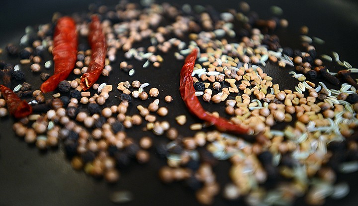 A mix of freshly toasted spices will go into Tyler Thompson's new batch of fudge including Indian and Mexican chilis, coriander, black pepper, cloves, cardamom, turmeric, fenugreek, fennel, lto which he will add lemon peel and coconut essence. (Brenda Ahearn/Daily Inter Lake)