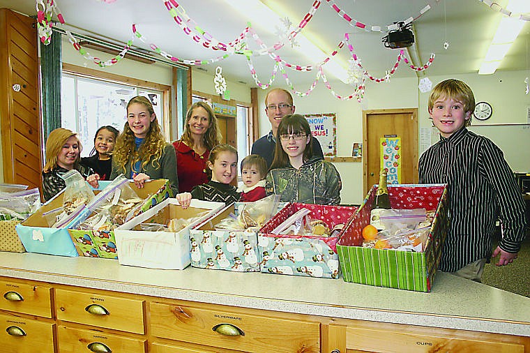 Ashley Cardenas, Ameris Velez, Alesha Evans, Karen Evans, Mandy Velez, Alexis Carter, Brian Iseminger, Brianna Reichert and Jim Hanson stand with the nine packed holiday boxes.