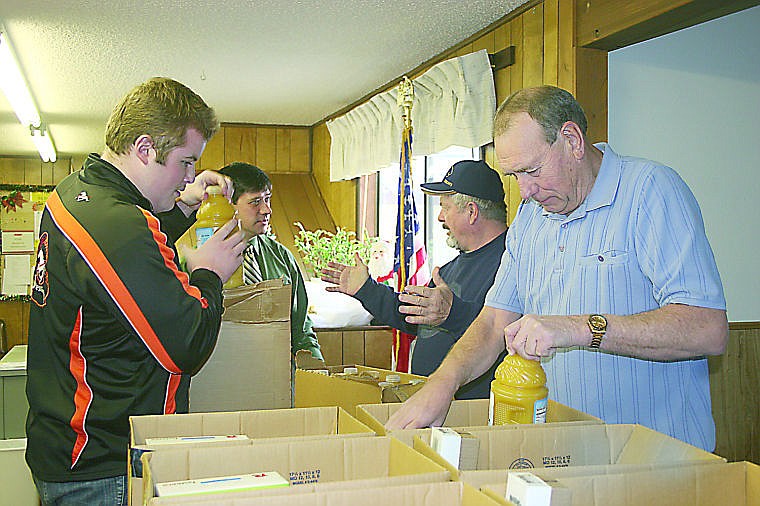 Ben Gorham unloads orange juice while Carl Pope loads them into the boxes. Pope delivers the boxes every week to those who are unable to pick them up.