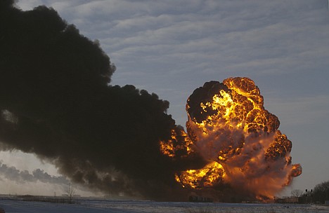 CASSELTON, N.D. - Authorities urged residents to evacuate a small North Dakota community Monday night after a mile-long train carrying crude oil derailed outside of town, shaking residents with a series of explosions that sent flames and black smoke skyward.