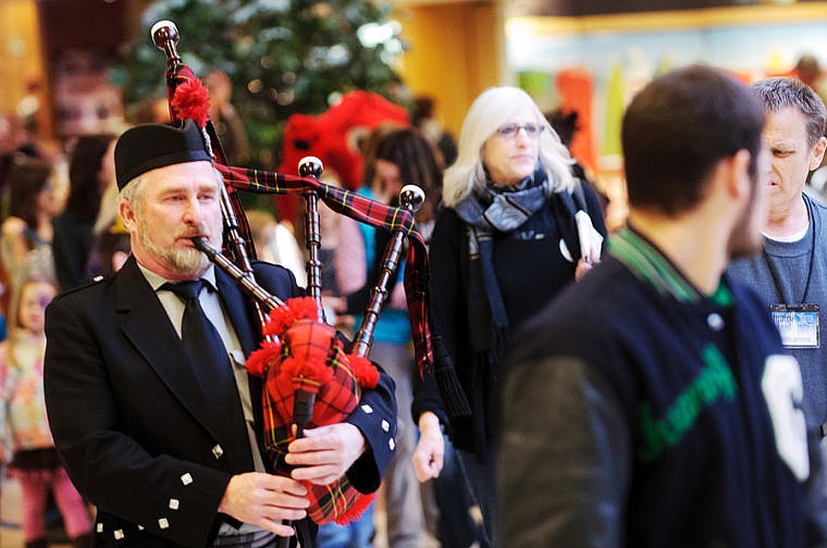 Montana Highlanders pipe major Rod Douglas leads the procession Tuesday afternoon during the First Night Flathead Commencement Parade at the Kalispell Center Mall.