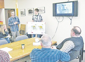 Lincoln County commissioners Ron Downey and Tony Berget listen as Washington State University Civil Engineering students Blake Nelson and Steven Williams use visual aids to explain the details of a bio-mass study during their meeting Wednesday. Also listening is Kootenai River Development Council Deputy Director Brigid Burke, left.