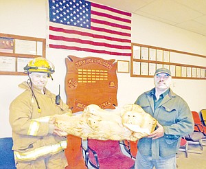 Troy Volunteer Firefighter Dan Harvey and local artist Steph Fracul hold a carved piece of art Fracul donated to the Fire Department. The firefighters will raffle the carved salmon and grizzly bear sculpture to raise money. They plan to sell 1,000 tickets at $5 each for the intricate wood and antler sculpture. The majority of the money would go to the department’s effort to attend a fundraiser in Seattle for the Big Climb, a physical challenge that will raise money for The Leukemia & Lymphoma Society.