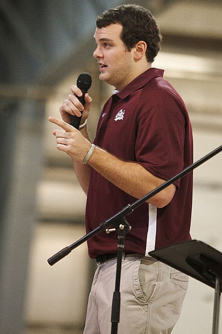 Glacier High School graduate Shay Smithwick-Hann speaks Friday afternoon during the Graduation Matters Kalispell event at the Flathead County Fairgrounds. Around 750 eight grade students from around the valley signed a pledge to graduate from high school. Friday, Feb. 1, 2013 in Kalispell, Montana. (Patrick Cote/Daily Inter Lake)