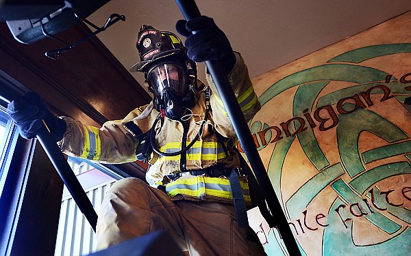 Taylor Zachary of the Kalispell Fire Department wears his gear as he does a round of stair climbing at Brannigan’s Pub on Saturday in Kalispell. Firefighters were at the pub as part of a fundraising campaign. Zachary and five other firefighters will compete in the 22nd Annual Scott Firefighter Stairclimb in Seattle on March 10. The firefighters are paying their own registration and travel expenses. All money raised goes to the Leukemia & Lymphoma Society. The next fundraiser is Feb. 13 at the Tamarack Brewing Co. in Lakeside.