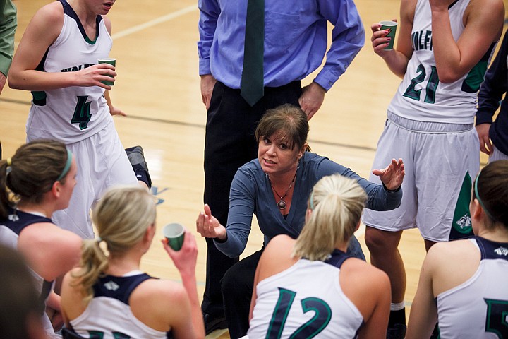 Glacier head coach Kris Salonen talks to her team during Glacier's home victory over Missoula Sentinel on Tuesday, Feb. 5, 2013. (Patrick Cote/Daily Inter Lake)