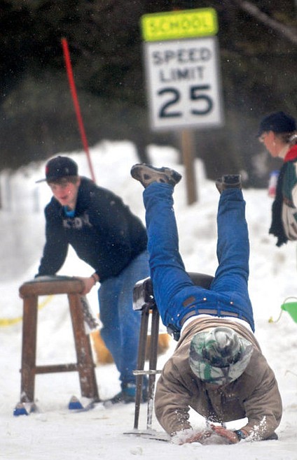 A Barstool Ski Race contestant goes head first off his stool while competing down Sugar Hill in Martin City in 2008.