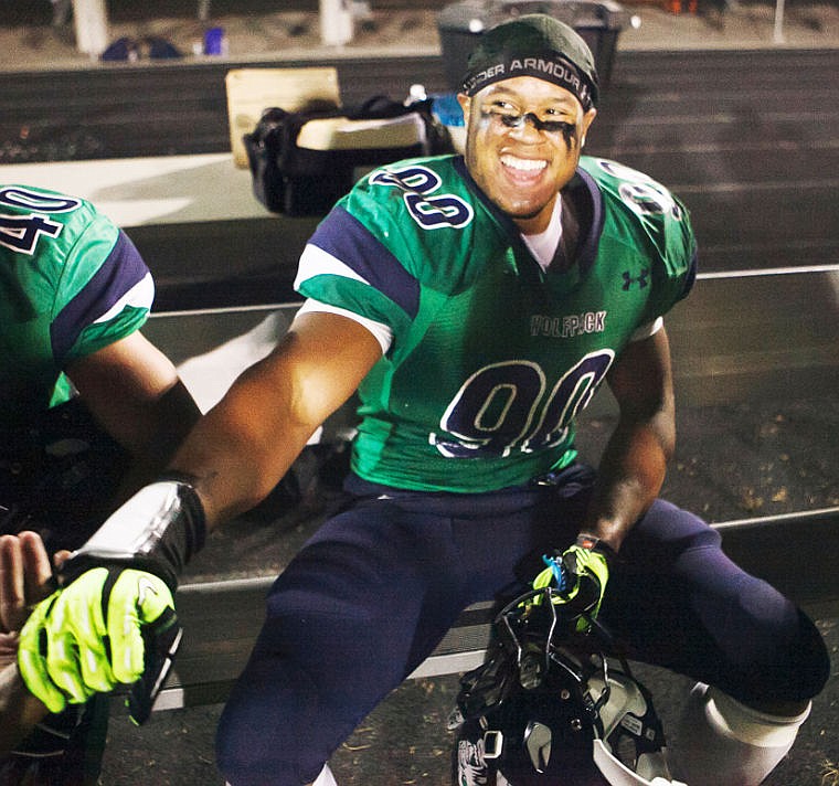 Patrick Cote/Daily Inter Lake Glacier defensive lineman Devin Jeffries (90) celebrates on the sidelines Friday night during the sixth crosstown matchup at Legends Stadium. Friday, Sept. 28, 2012 in Kalispell, Montana.