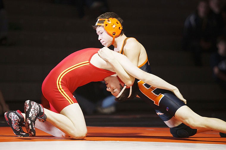 Patrick Cote/Daily Inter Lake Flathead sophomore Dyan Guzman (right) sprawls to avoid a takedown during his 112-pound match against Shawn Olson Tuesday evening during Flathead's home dual against Missoula Hellgate. Tuesday, Dec. 18, 2012 in Kalispell, Montana.