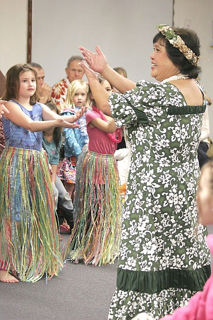 Dralin Arnold shows Trout Creek students Serenity Barrus, Gabrielle Hannum, and Julissa Bonney the steps and arm movements of the Hawaiian dance, the Hukilau at the Hawaiian-themed Family Fun Night.
