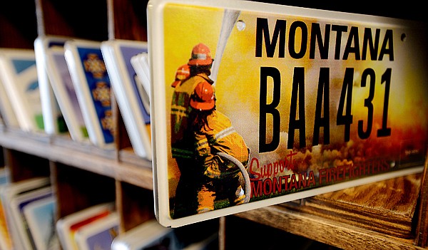 Rows of specialty license plates including a "Support Montana Firefighters" design on Tuesday afternoon, February 5, at the Department of Motor Vehicles in Kalispell. (Brenda Ahearn/Daily Inter Lake)