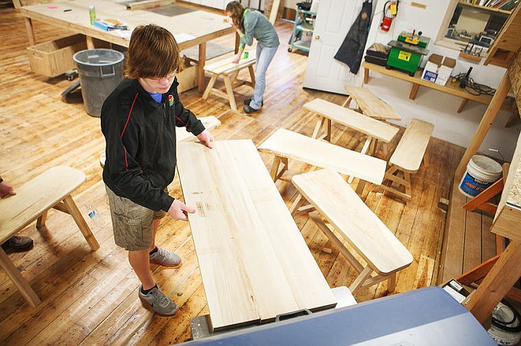 Freshman Jake Bedoian loads a board of American elm through a planer Thursday morning at Flathead High School. The board will serve as the the top of a bench Bedoian is making in wood shop. Last semester the class made 98 benches out of the dead elm trees that were removed from Kalispell neighborhoods.