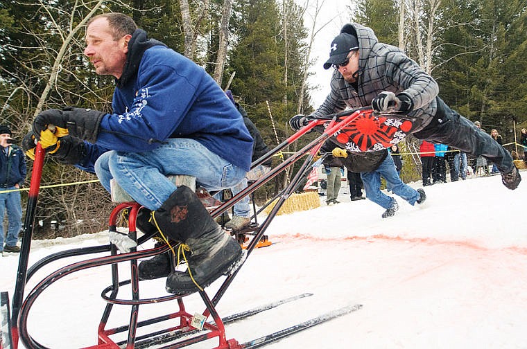 Lenny Hart, right, gives his uncle Buddy Hart a flying push during the World Championship Barstool Races in 2013 at Cabin Fever Days in Martin City. The 2014 edition of Cabin Fever Days is Friday through Sunday.