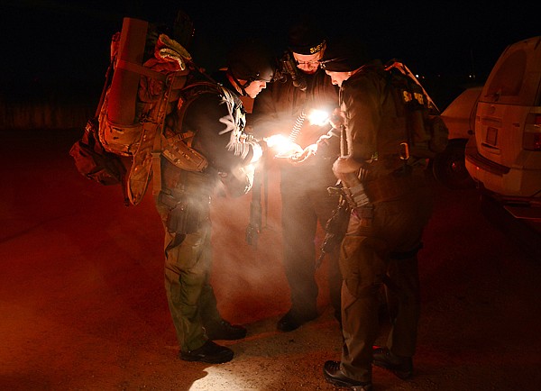 Flathead County Sheriff's Department SWAT team members meet with Patrol Commander Calvin Beringer, center, before moving toward the scene of a report of shots being fired in Somers early Saturday, Feb. 9. (Brenda Ahearn/Daily Inter Lake)