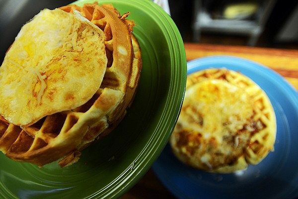 Zermatt Waffles, studded with Swiss cheese and bacon and served with two eggs and syrup, at the Basecamp Cafe on Friday, February 8, in Columbia Falls.