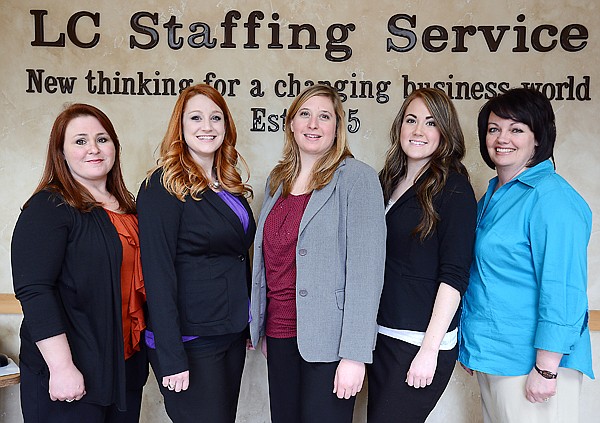 Amy Slomba, left to right, Kate Lennick, Valerie Cooper, Emily Kroll and Theresa Fisher at LC Staffing on Tuesday, February 12, in Kalispell. (Brenda Ahearn/Daily Inter Lake)