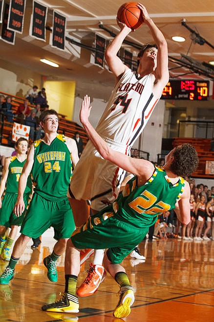 Flathead’s Garth West (44) shoots over Whitefish’s Jace Kalbfleisch (22) Tuesday night during a nonconference basketball game against Whitefish at Flathead High School. (Patrick Cote/Daily Inter Lake)