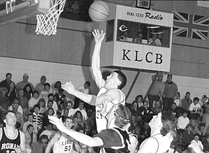 Corey Andersen, Libby's high scorer goes for two over the top of Ronan defenders. The Loggers edged Ronan by one point for the second time. The 8-7 Loggers play their final two road games this weekend with a game Friday at Troy and Saturday at Polson. Libby needs two wins in its final three games to insure a winning season. Chuck Blair photo from the Feb. 10, 1993, files of The Western News.