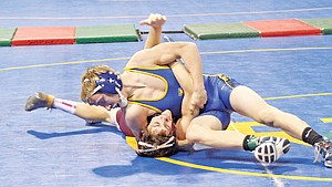 Zach Crace (125) takes down an opponent at the state tournament in Billings. Crace, along with four other Greenchain athletes, made it to the second day of the tournament. Mitch Haugen, Austin Bailey, Garret Chapel and Zack Dolezal were the others who made the second day.