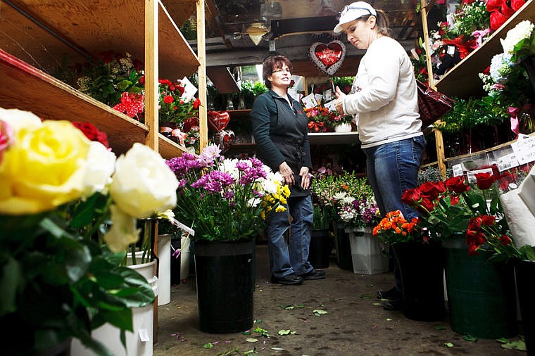 Kimarie Wolf, left, helps Joda Taylor select flowers Wednesday afternoon at Woodland Floral in Kalispell. Taylor is traveling to Arizona to visit her son on Valentine's day and was putting together a bouquet of flowers for her son's fiancée. Wednesday, Feb. 13, 2013 in Kalispell, Montana. (Patrick Cote/Daily Inter Lake)