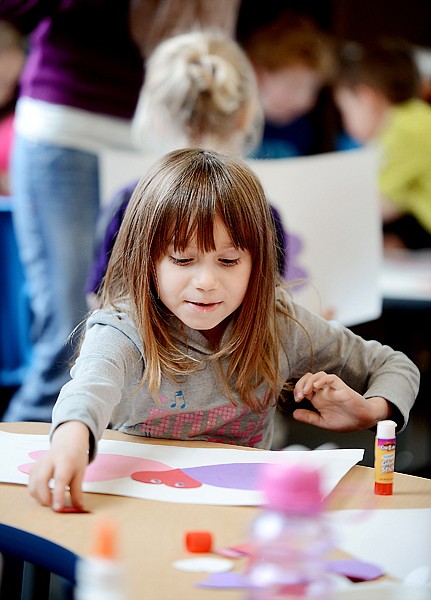 Raine Hudson, a kindergartener at Hedges Elementary School works on a Valentine's Day project on Thursday, February 14, in Kalispell. (Brenda Ahearn/Daily Inter Lake)