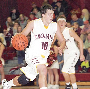 Gabe Hickman, Troy’s standout junior guard, drives the lane against Class C Noxon in mid-December. Hickman’s showy scoring has pushed Troy to second in District 7-B.