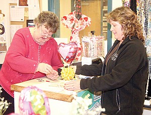 St. John’s Lutheran Hospital Auxiliary President Jan Kendall completes a sale to Sandy Heinlein during the SJLH Gift Shop’s pre-Valentine’s Day sale on Wednesday. Heinlein, who works in the hospital’s business office, purchased a coffee cup, balloon and candy for her husband, John. The gift shop, located near the main entrance, is open from 10 a.m. to 2 p.m. Monday through Friday. However, beginning March 1, the shop will be open from 9:30 a.m. to 5:30 p.m. Thursday. The store was loaded with holiday shoppers, as it was offering 10 percent off items during the special Valentine’s Day sale.