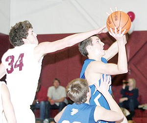 Junior center Bruce Metz pokes away a ball from Thompson Falls’ Baptiste Seynaeve in the second quarter of Troy’ s playoff win at home. Metz was returning from a leg injury.