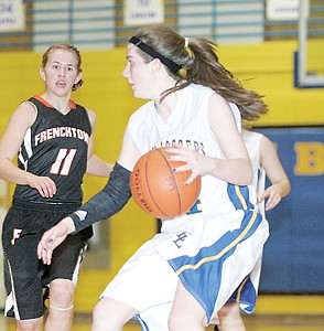 Libby’s sophomore wing Hailey Craig sets up the offense in the Lady Loggers’ narrow loss to Frenchtown. Craig hit six 3-pointers as part of her 23 points.