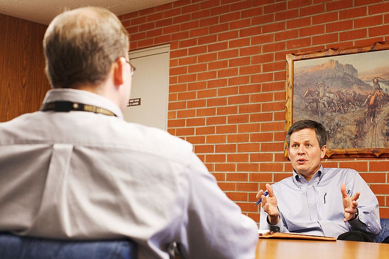 Rep. Steve Daines, R-Mont., right, talks with Montana Veterans Home Superintendent Joren Underdahl on Wednesday afternoon in Columbia Falls.