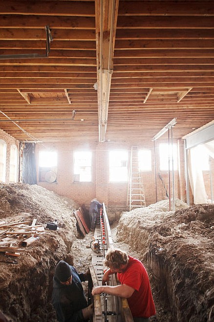 Tony DeMarco, left, and Karl Hoffman align concrete forms that will be the new back wall of the Kalispell Brewing Company. Thursday, Feb. 21, 2013 in Kalispell, Montana. (Patrick Cote/Daily Inter Lake)