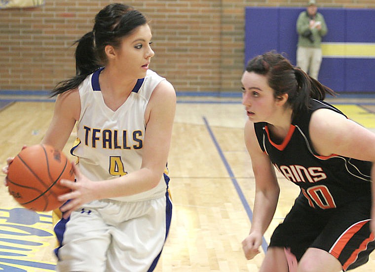 Senior Lady Hawk Kelsey Fitchett tries to dribble and pass the ball past Senior Trotter Jessica Hansen during the heated rivalry game on Thursday night before the District Tournament in Ronan.